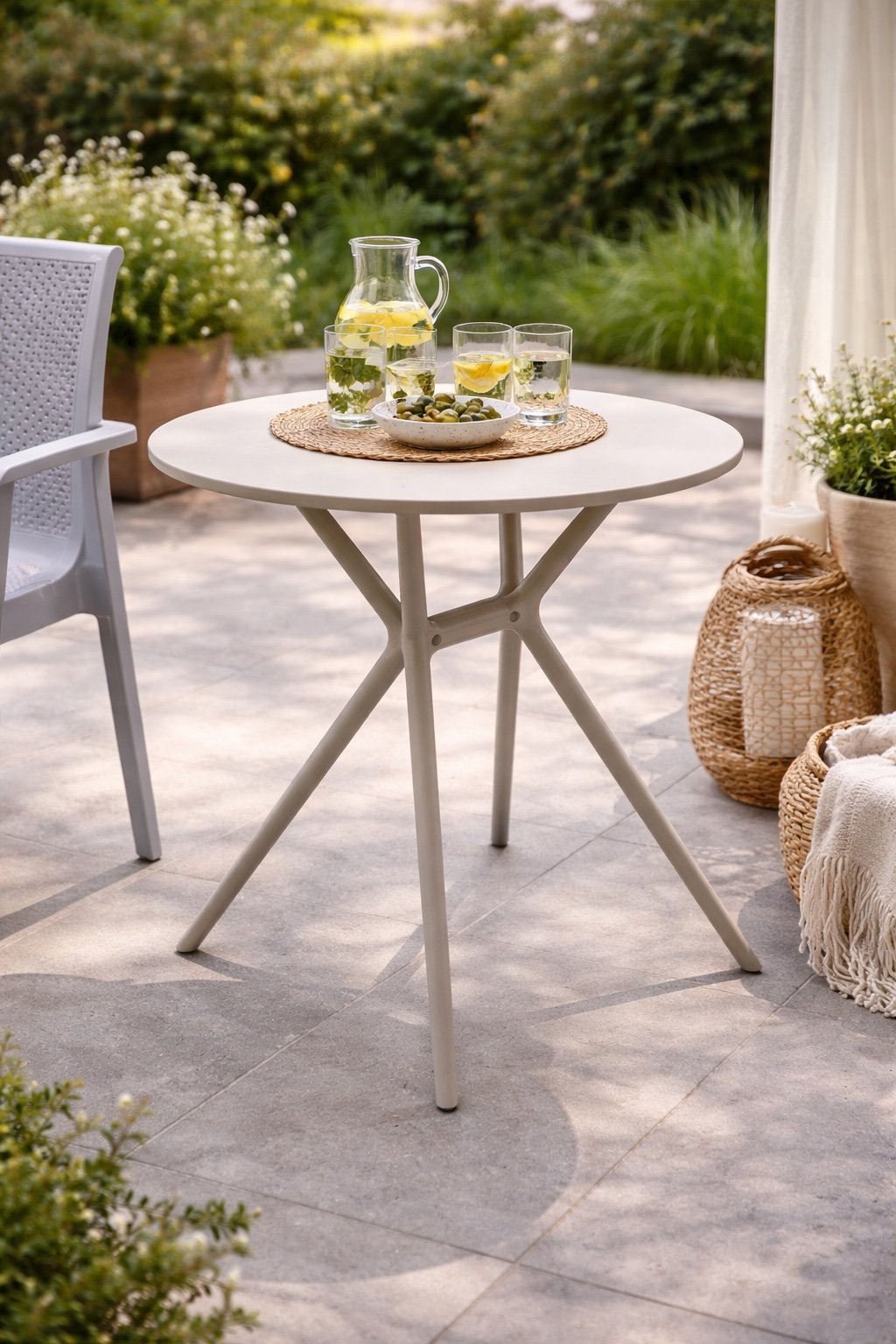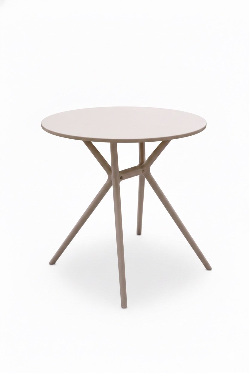 This compact patio table is designed for outdoor dining and casual use on balconies, terraces, and garden spaces. Made using virgin plastic casting, it offers high hardness and strength for durability in outdoor conditions. The round tabletop and slim base create a balanced, space-efficient profile suitable for smaller settings. Dimensions: diameter 66 cm, height 73 cm.