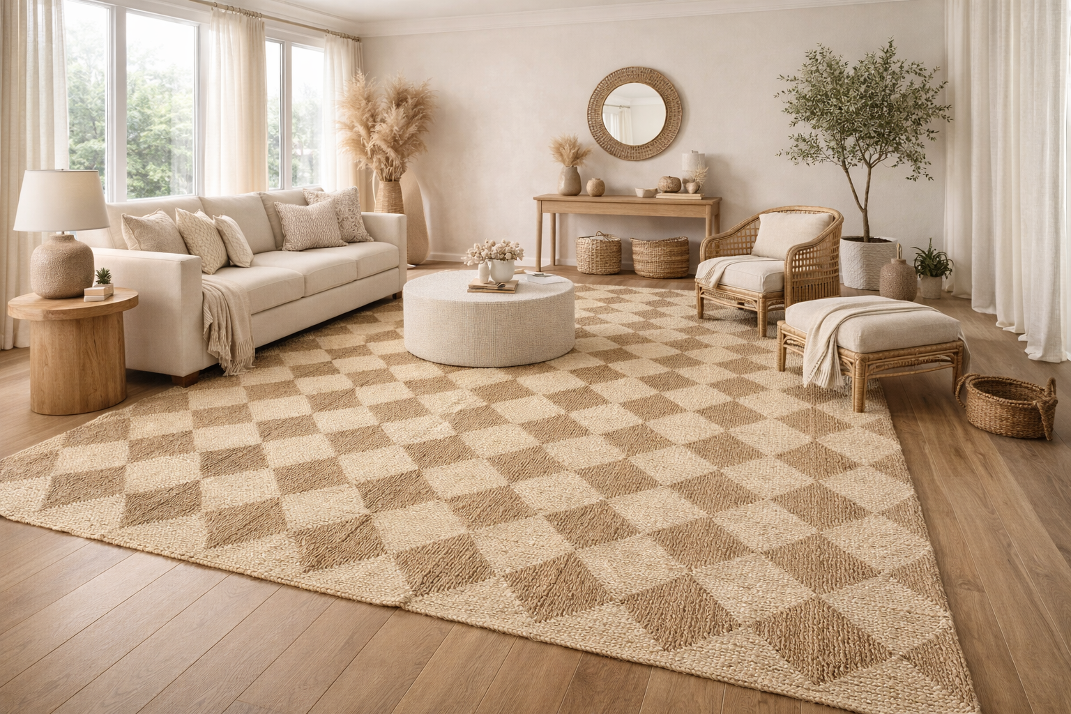 The 2 x 3 Gaia Seagrass Rug is locally handwoven with a unique pattern, eco-friendly, and easy to clean, ideal for stylish, large spaces.