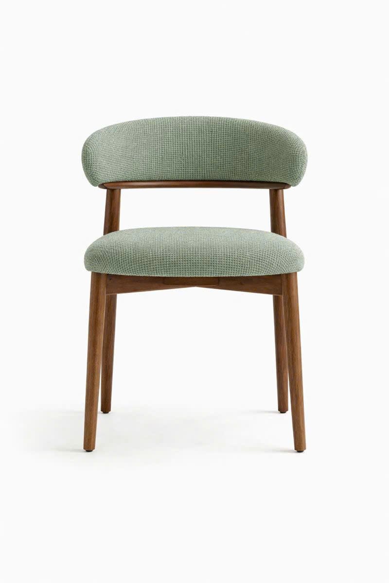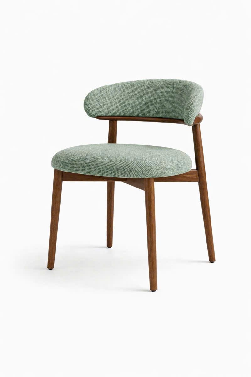 This upholstered dining chair features a walnut-toned oak frame paired with a felt fabric seat and backrest for a refined, comfortable seating experience. Its compact proportions and gently curved backrest provide support without visual heaviness, making it well suited to modern dining spaces. Designed for everyday residential use, the chair balances durability with understated elegance. Dimensions: W48 × D55 × H78 cm, seat height 45 cm.