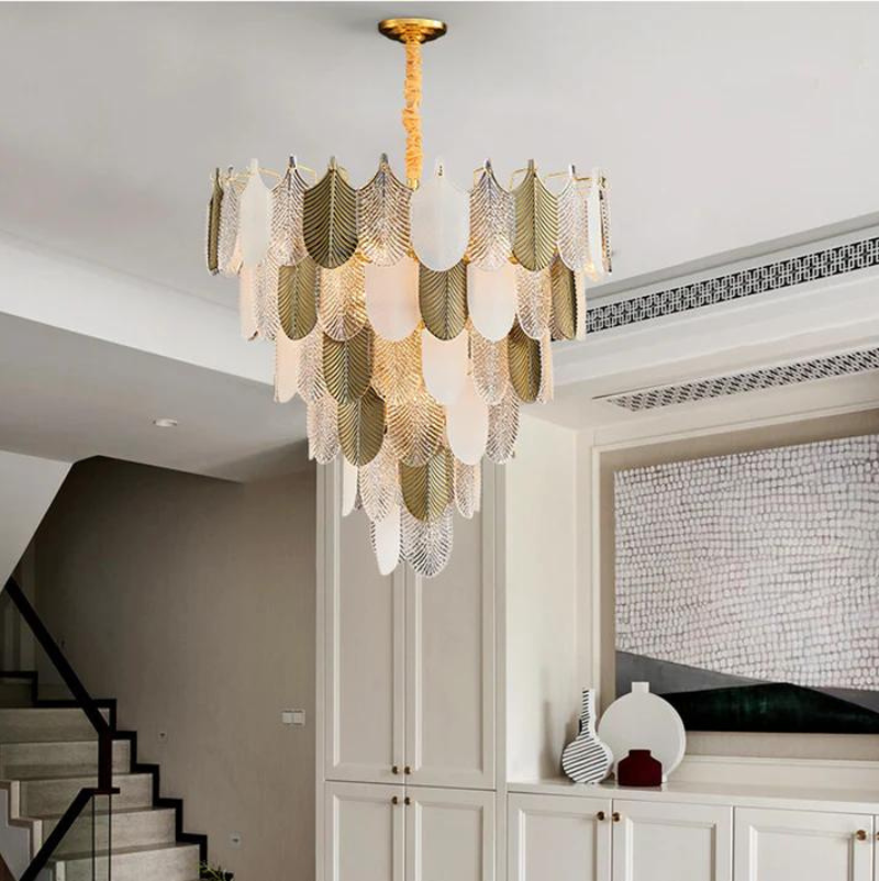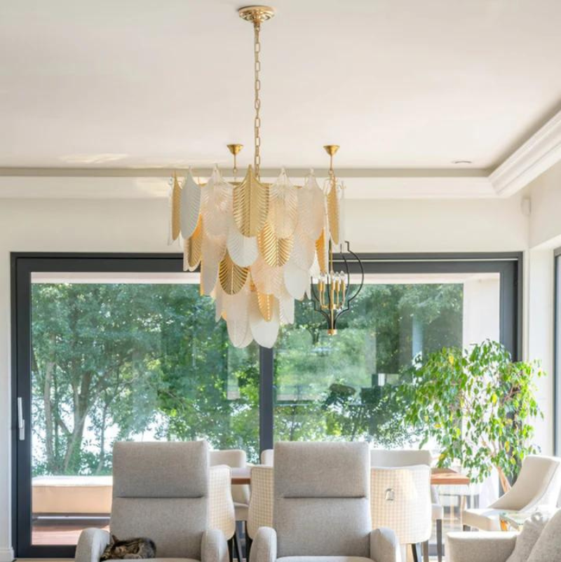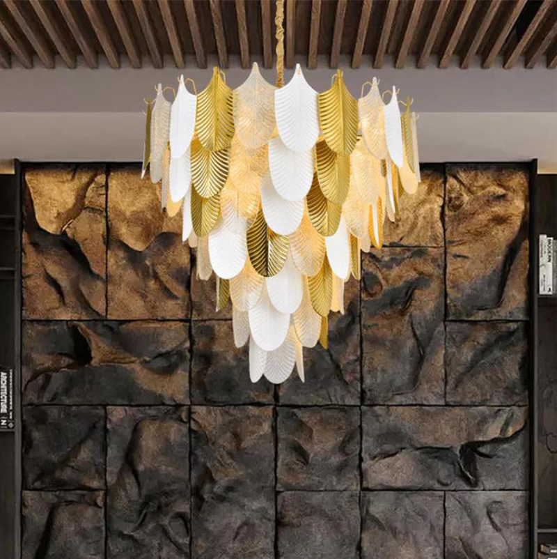 The Harper Lamp is an exquisite proposal for tall and opulent interiors, designed to bring a touch of luxury and sophistication to your space. Its lights resemble delicate leaves, crafted from a variety of high-quality materials. The lamp features a rich color palette with gold, white, and clear glass containing closed air bubbles, creating a dynamic and elegant composition that enhances any room’s décor.
