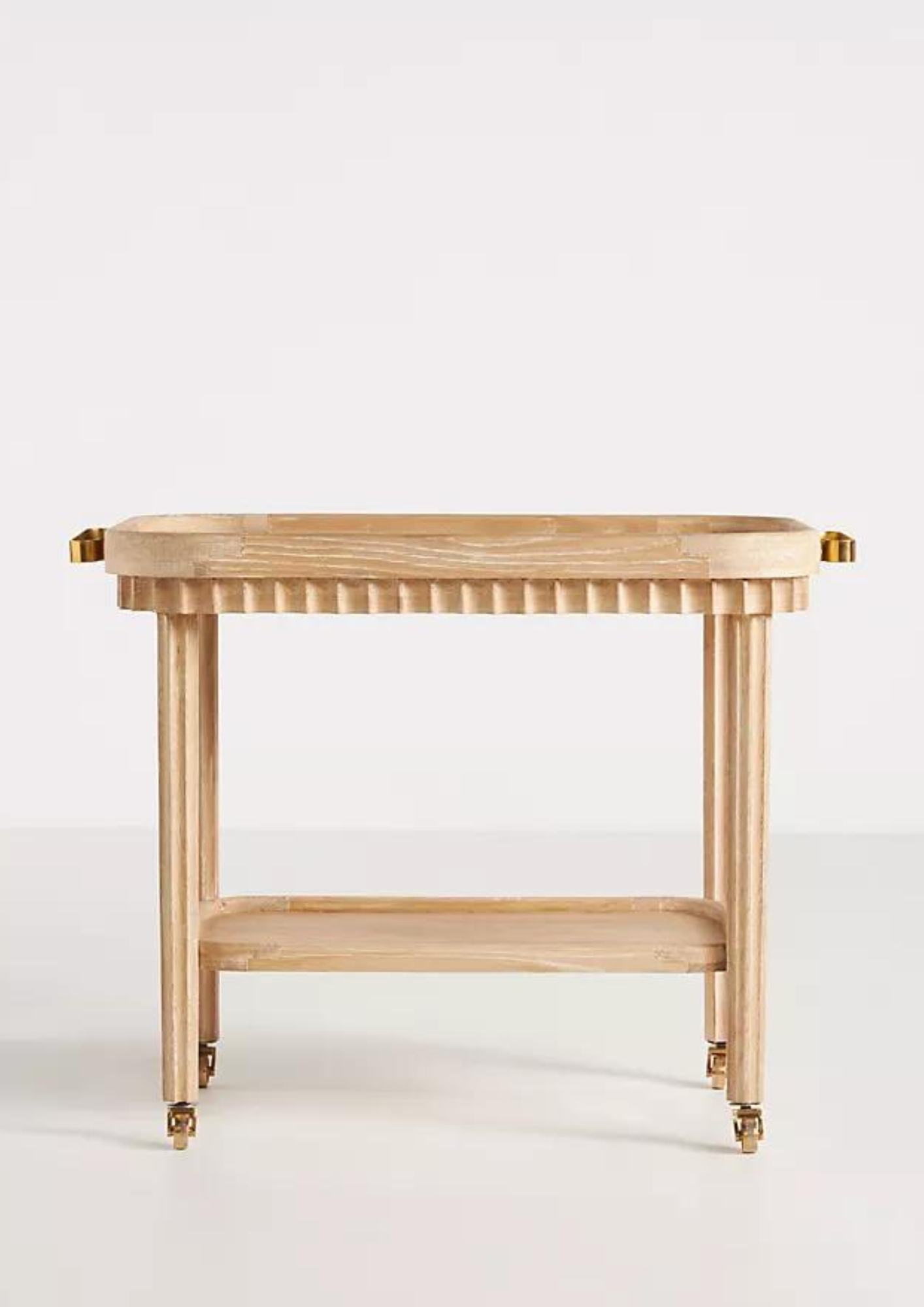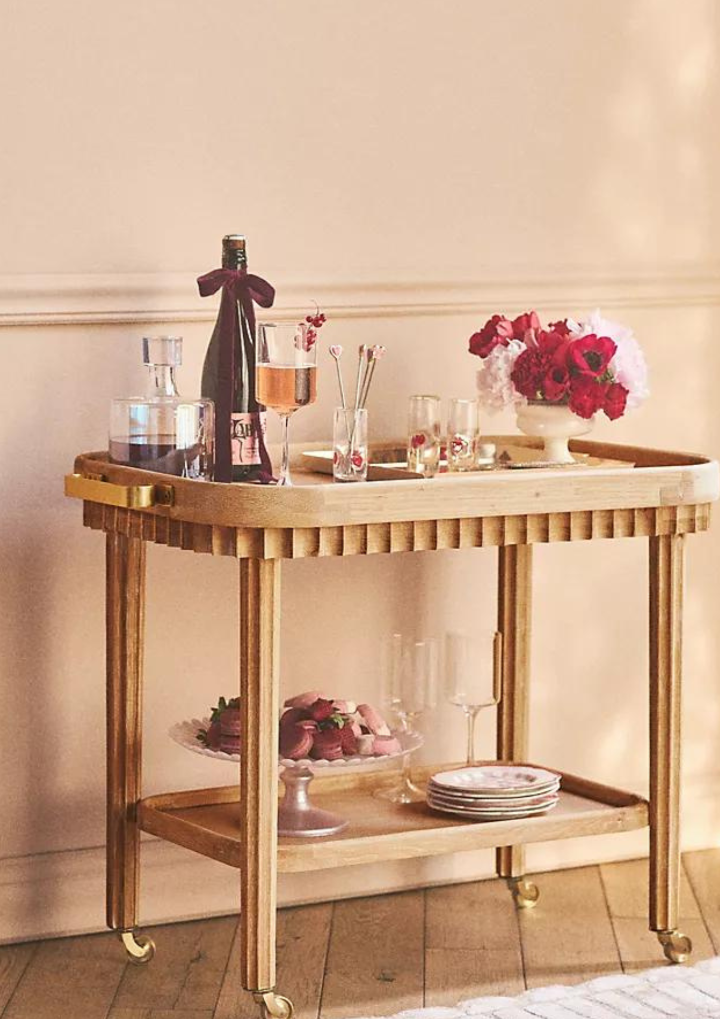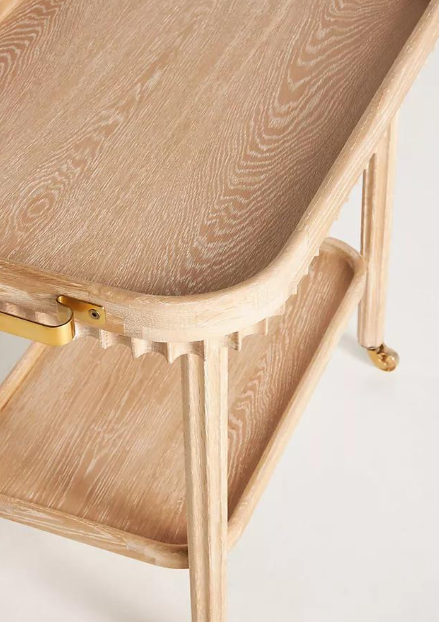 Introducing the Jasper Bar Cart, a fusion of sleek design and timeless elegance, the Jasper Bar Cart adds a touch of sophistication to any space. Featuring a grooved trim lining the edges, this classic bar cart exudes understated luxury and charm.