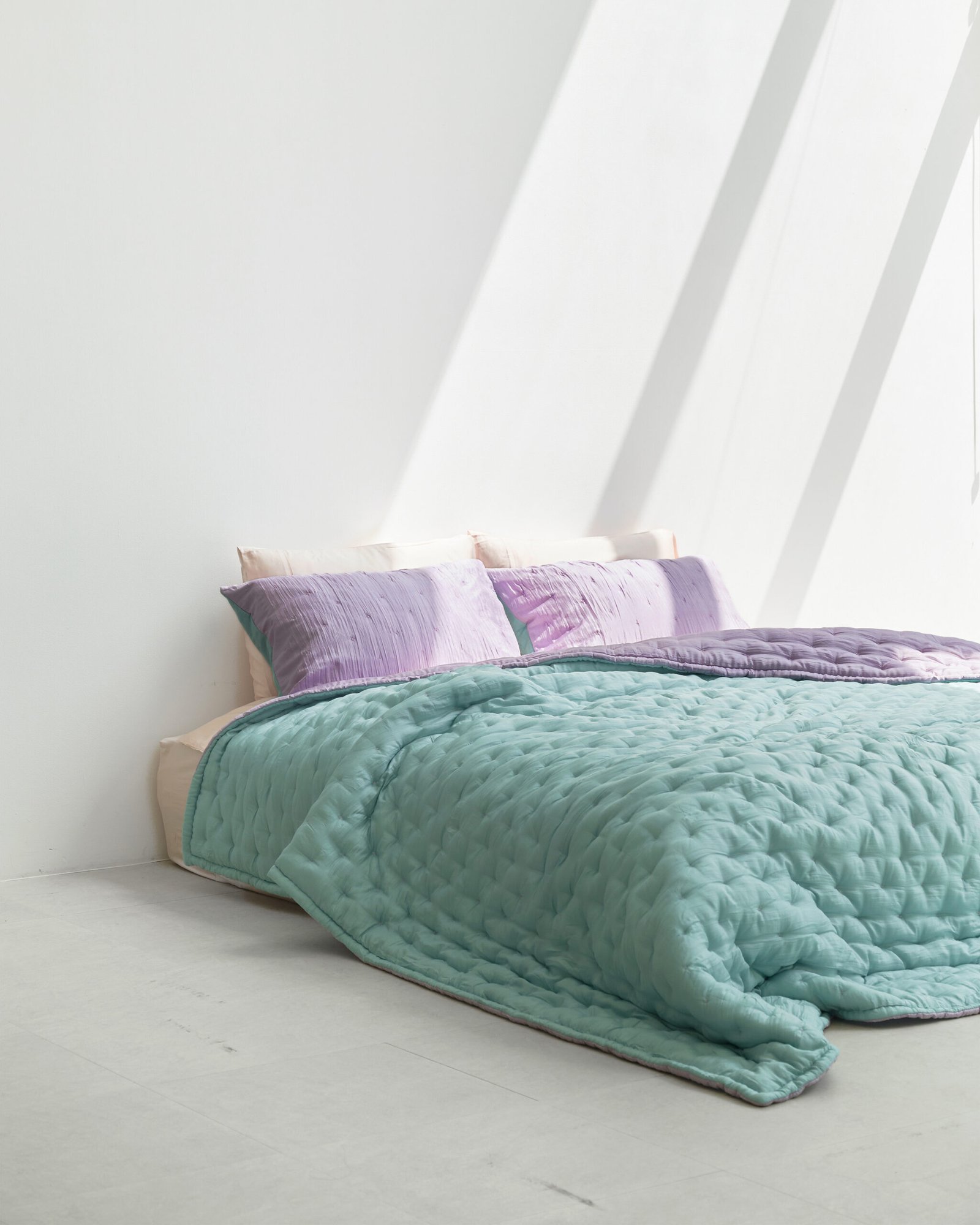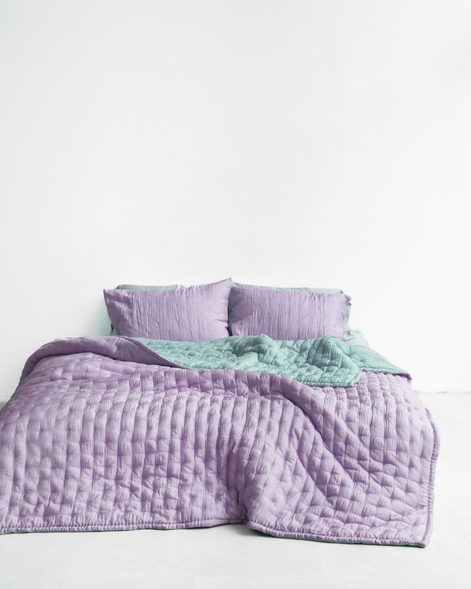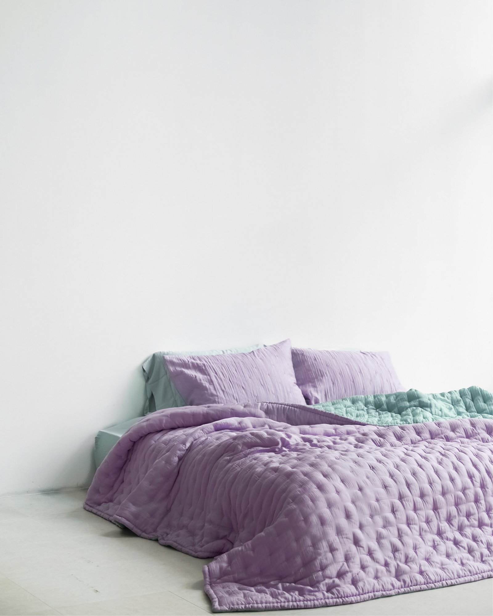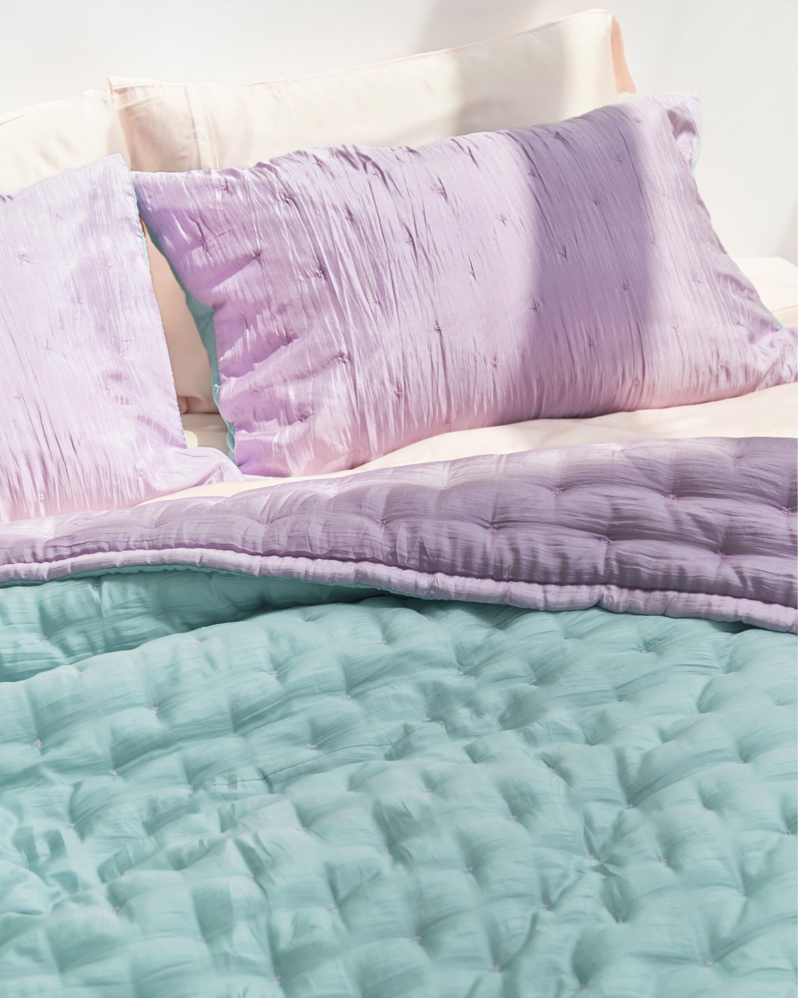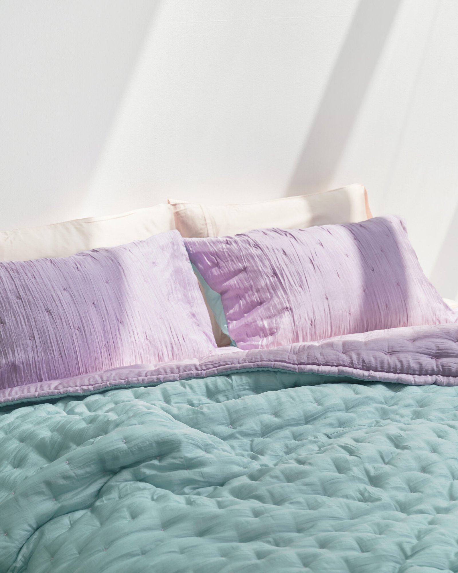 With its charming color combination and varied size options, the Lilac & Baby Blue Silk Quilted Duvet offers a stylish and personalized addition to your bedroom decor.