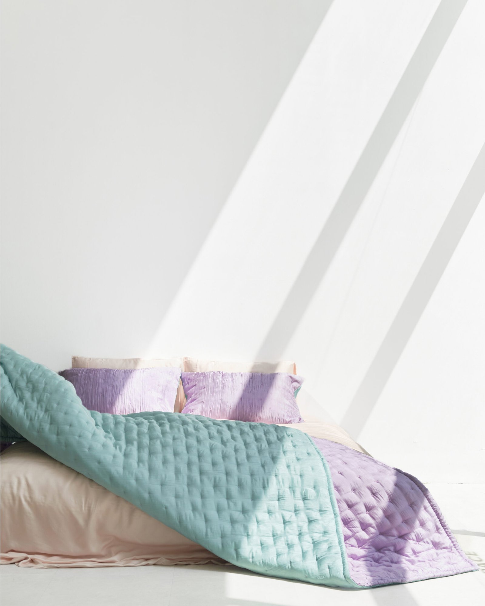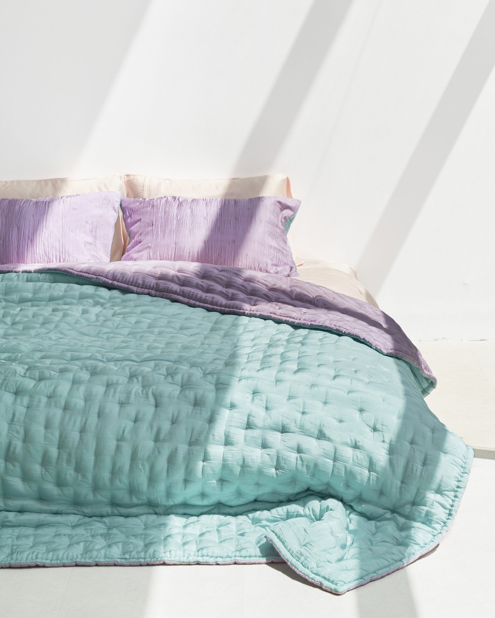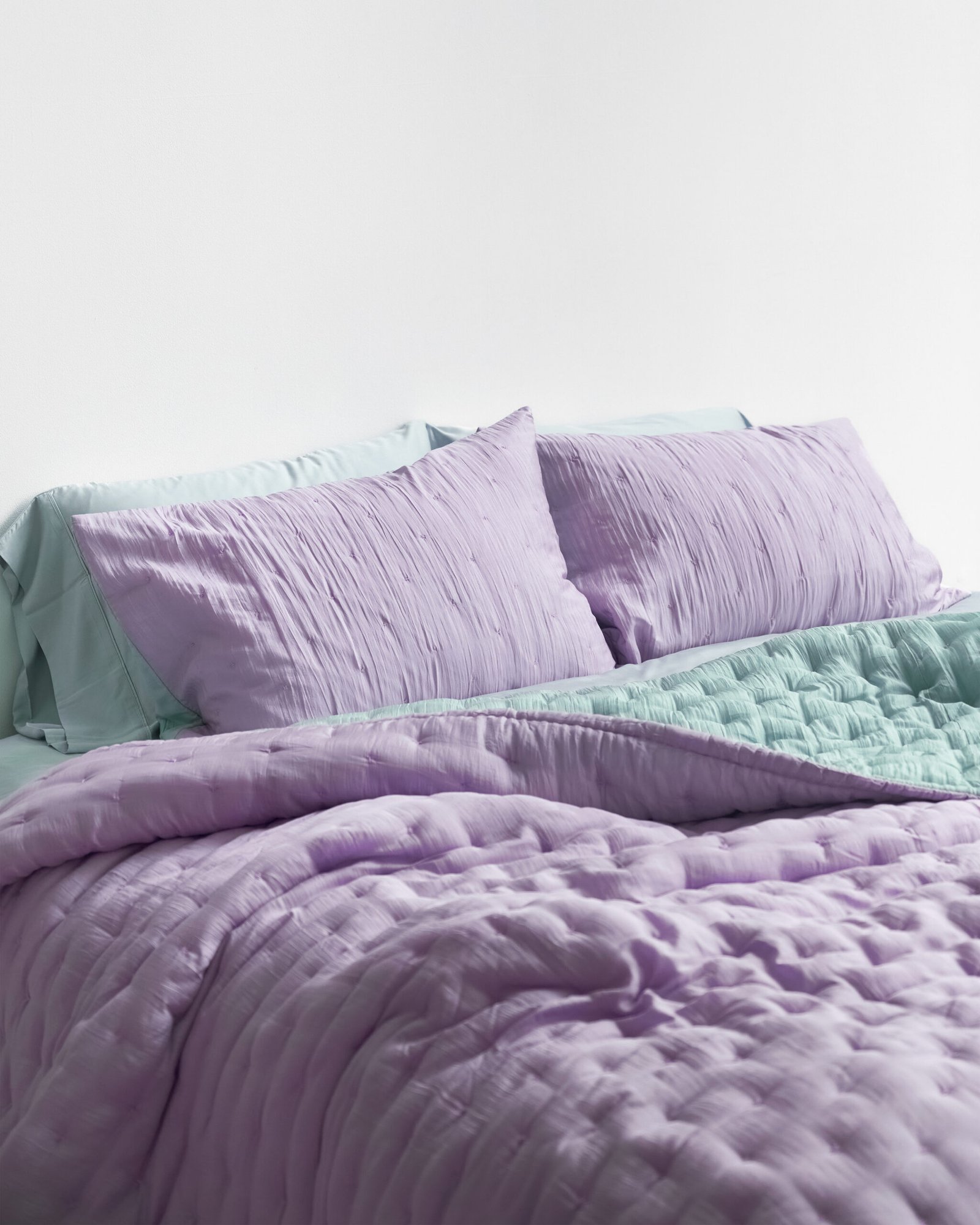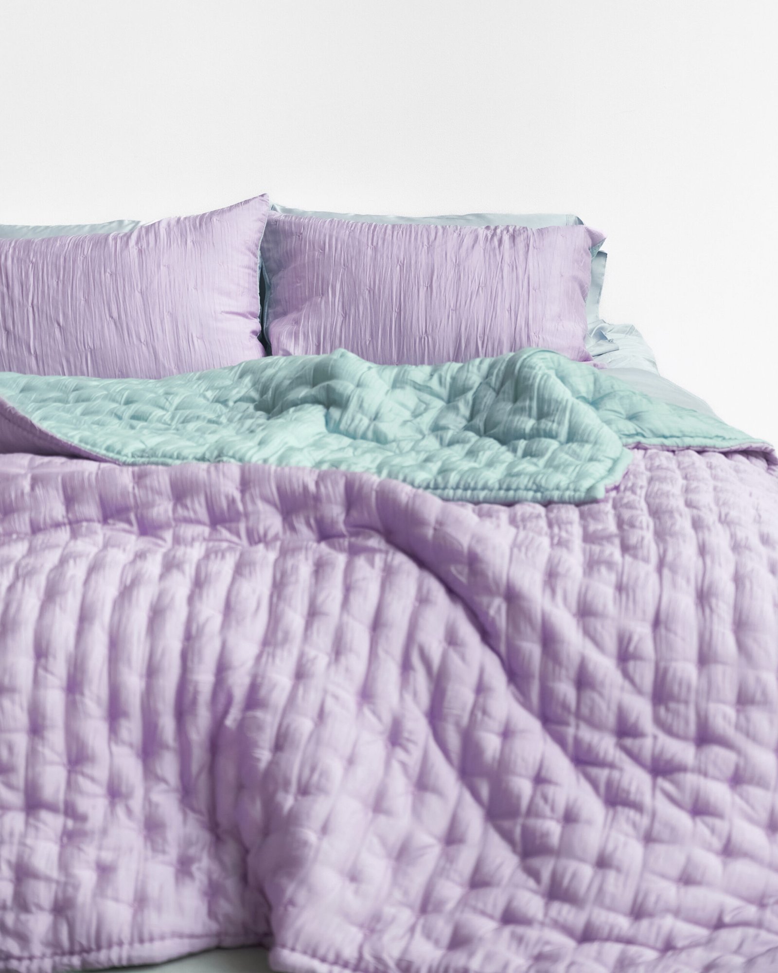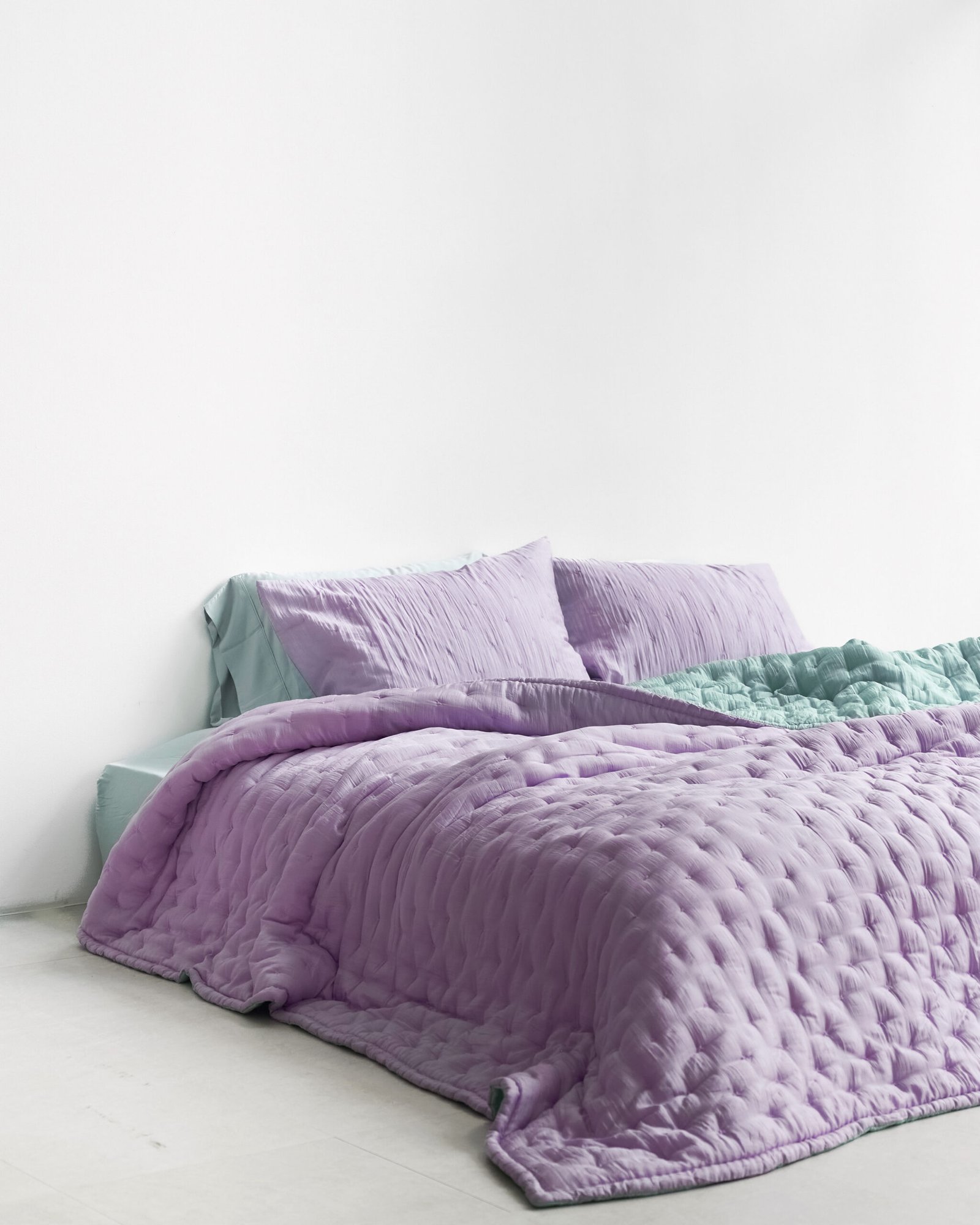 With its charming color combination and varied size options, the Lilac & Baby Blue Silk Quilted Duvet offers a stylish and personalized addition to your bedroom decor.